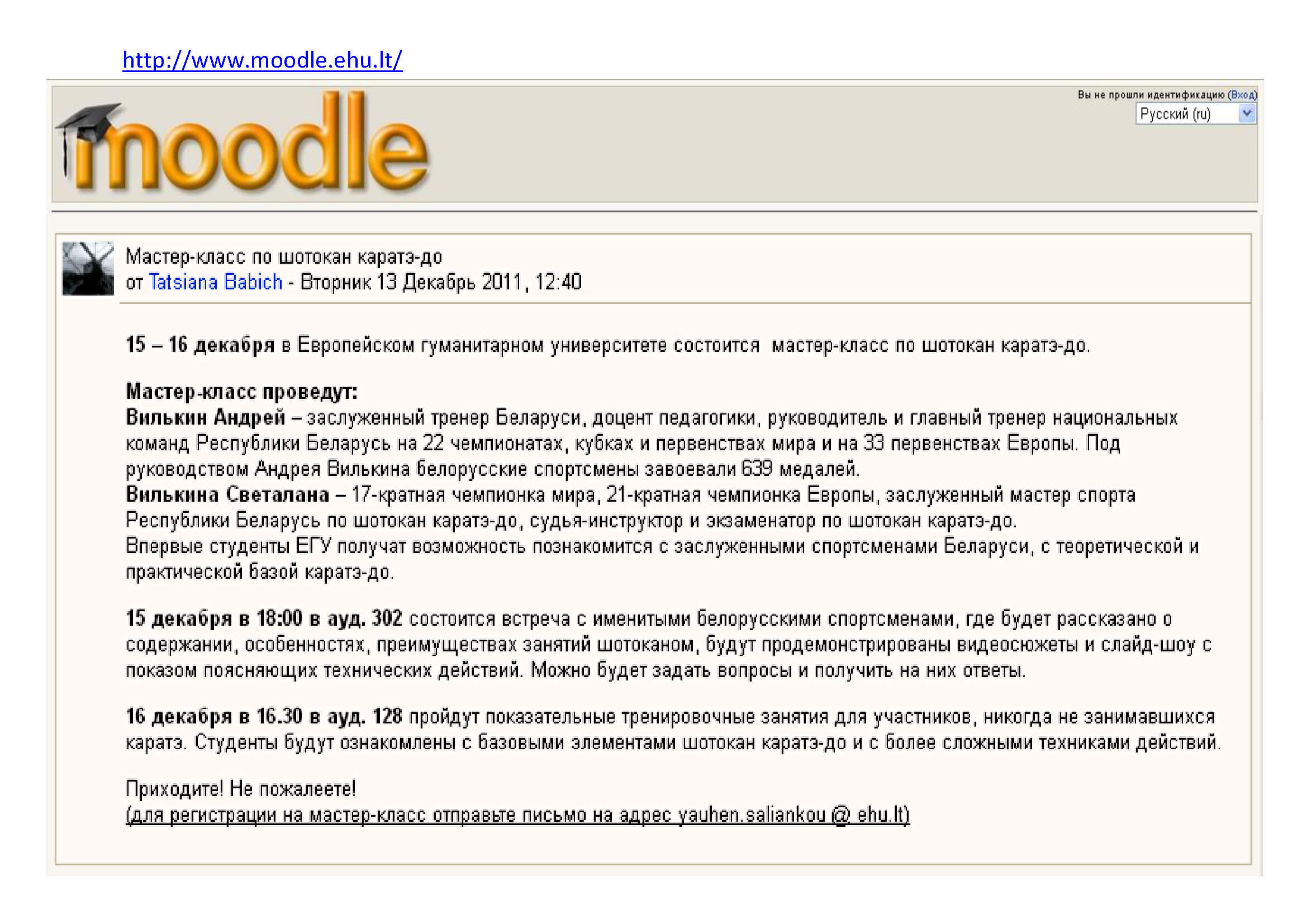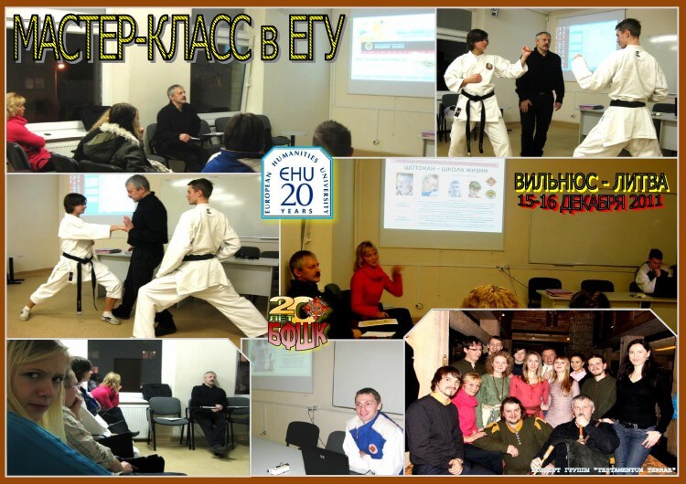 В программе мероприятий, посвященных 20-летию Белорусской федерации шотокан каратэ-до, по приглашению студенческого центра и администрации Европейского гуманитарного университета 15-16 декабря в Вильнюсе/Литва, также празднующего свое 20-летие, состоялся мастер-класс ведущих белорусских специалистов шотокана. Участники мероприятия с интересом прослушали сообщения о содержании, возможностях, особенностях и преимуществах занятий шотокан каратэ-до для студенческой молодежи, высоких международных достижениях белорусских мастеров. Рассказ руководителей Белорусской федерации шотокан каратэ-до и Академии каратэ А.Я. Вилькина и С.Б. Вилькиной чередовался с демонстрацией видеосюжетов и слайдов, показом поясняющих технических действий в исполнении ассистентов Алексея Вилькина и Инны Овсиневой, подробными ответами на поступающие вопросы.
