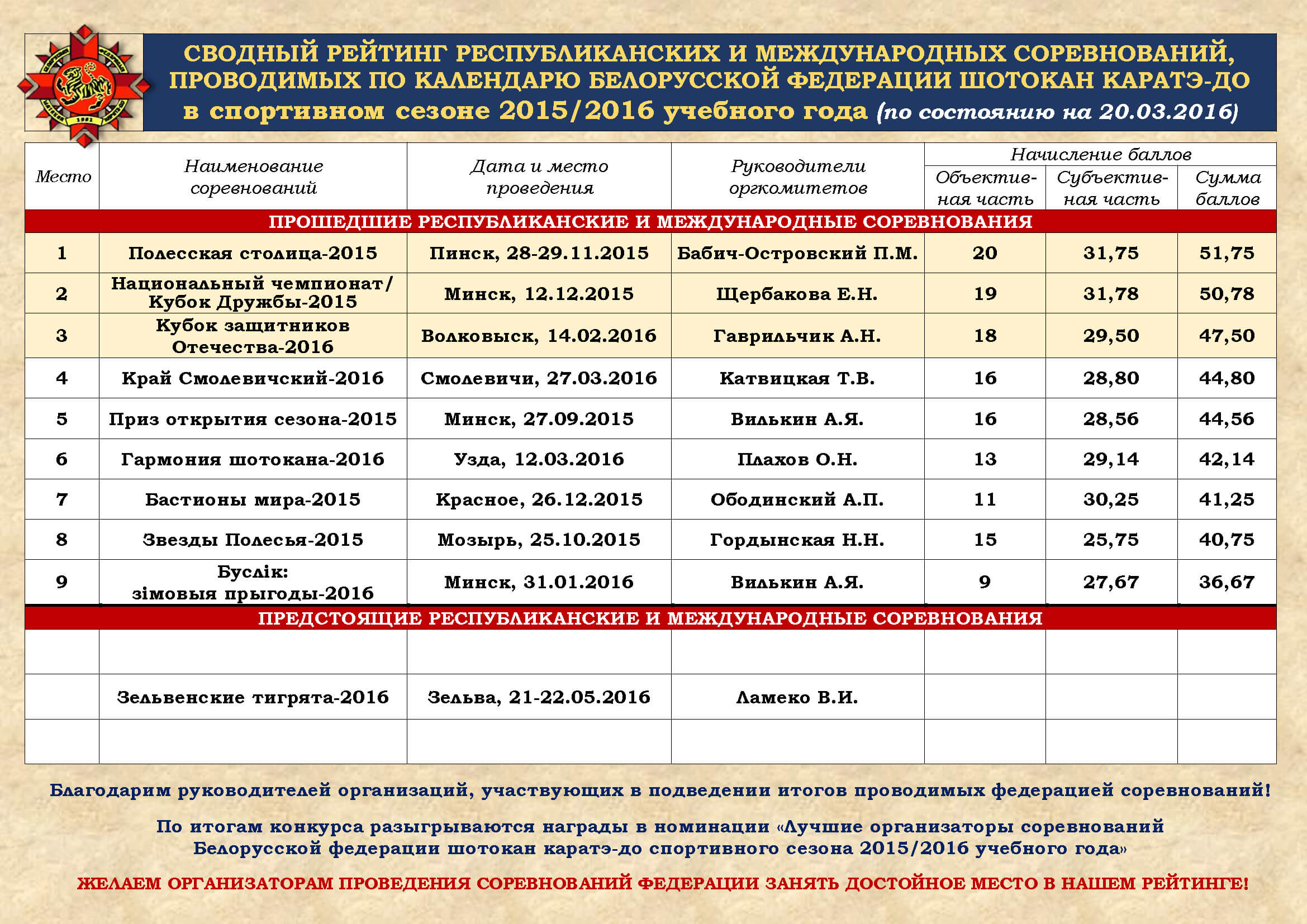 В соответствии с решениями Конференции Белорусской федерации шотокан каратэ-до в течении 2015-2016 учебного года формировался рейтинг официальных республиканских и международных соревнований федерации, включенных в календарные планы на первое и второе полугодия. В их число вошли 12 основных изолированных и спаренных (когда два соревнования проводились параллельно) спортивных турниров, состоявшихся в период с 27 сентября 2015 года по 15 мая 2016 года.
