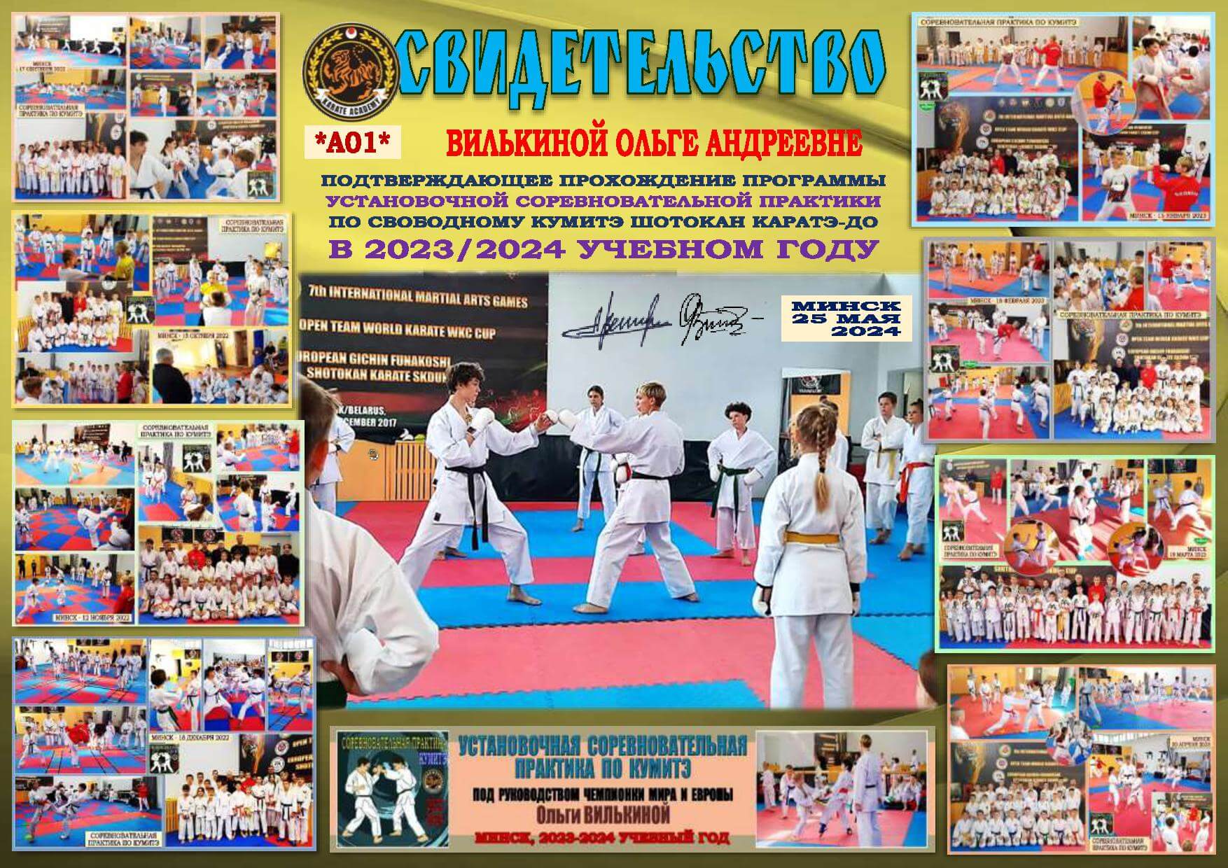 16 сентября 2023 года. Проведена первая по счету в программе сезона 2023-2024 учебного года соревновательная практика по свободному кумитэ под руководством многократной чемпионки мира и Европы, мастера спорта Ольги Вилькиной (5 дан). В проведении практических занятий и судействе выступлений спортсменов ей ассистировали заслуженный тренер Беларуси Андрей Вилькин (7 дан), заслуженный мастер спорта Светлана Вилькина (7 дан) и призер чемпионата Европы, чемпион Беларуси по кумитэ Сергей Лукашевич.