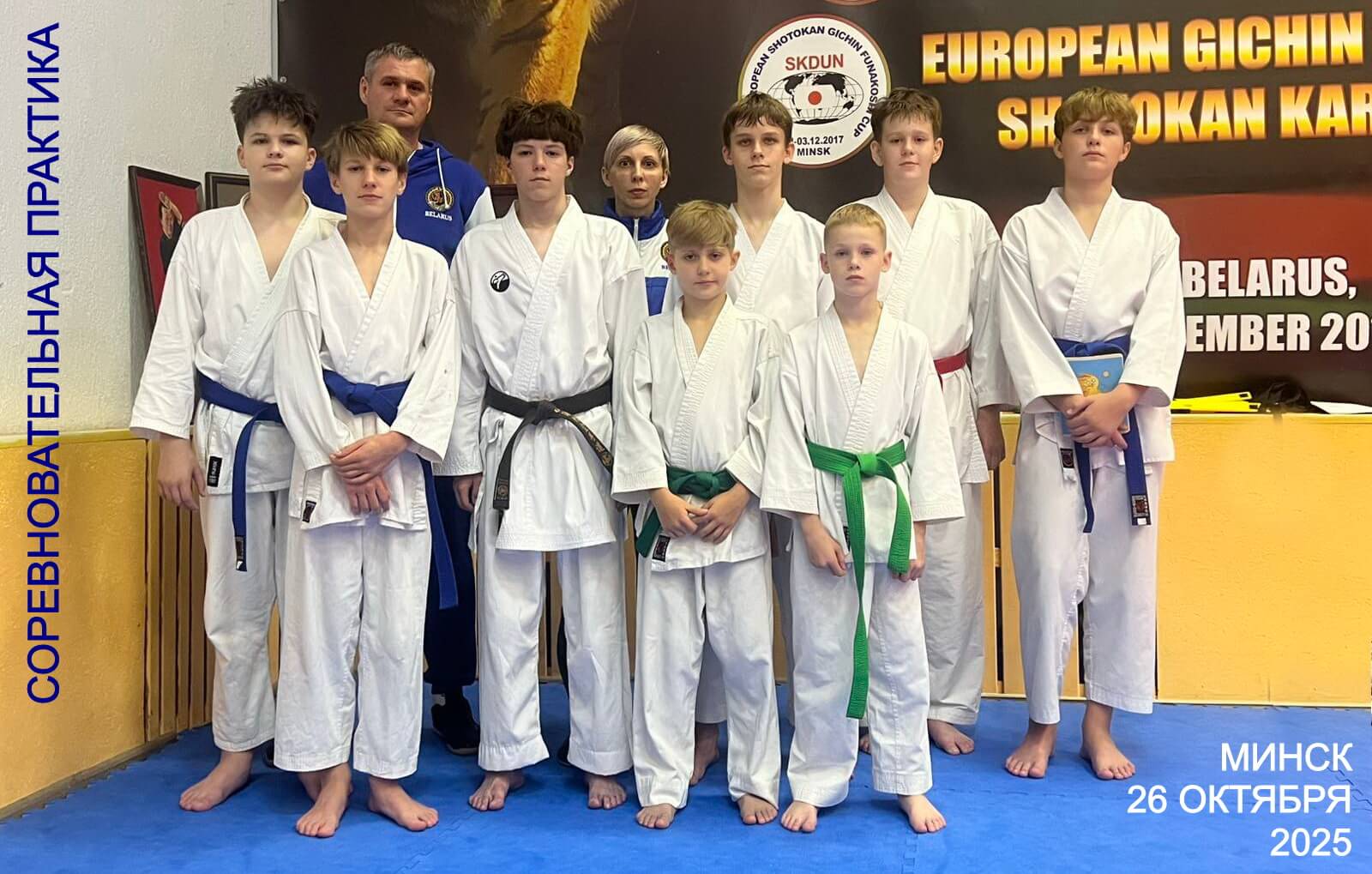 26 октября 2025 года. Вторая сессия соревновательной практики по свободному кумитэ 2025-2026 учебного года прошла под руководством многократной чемпионки мира и Европы, мастера спорта Ольги Вилькиной (VI дан). В организации мероприятия, ведении практических занятий и судействе выступлений спортсменов ей ассистировал призер чемпионата Европы, чемпион Беларуси по кумитэ Сергей Лукашевич. В работе участвовали 9 спортсменов из клубов Академия каратэ, Барс, Кэнкай. Были подведены итоги участия в открытом кубке БФШК Приз открытия сезона памяти А.В.Медведя в Минске 19 октября и намечен план подготовки к республиканским стартам Полесская столица-2025 памяти П.М.Бабич-Островского в Пинске 30 ноября.