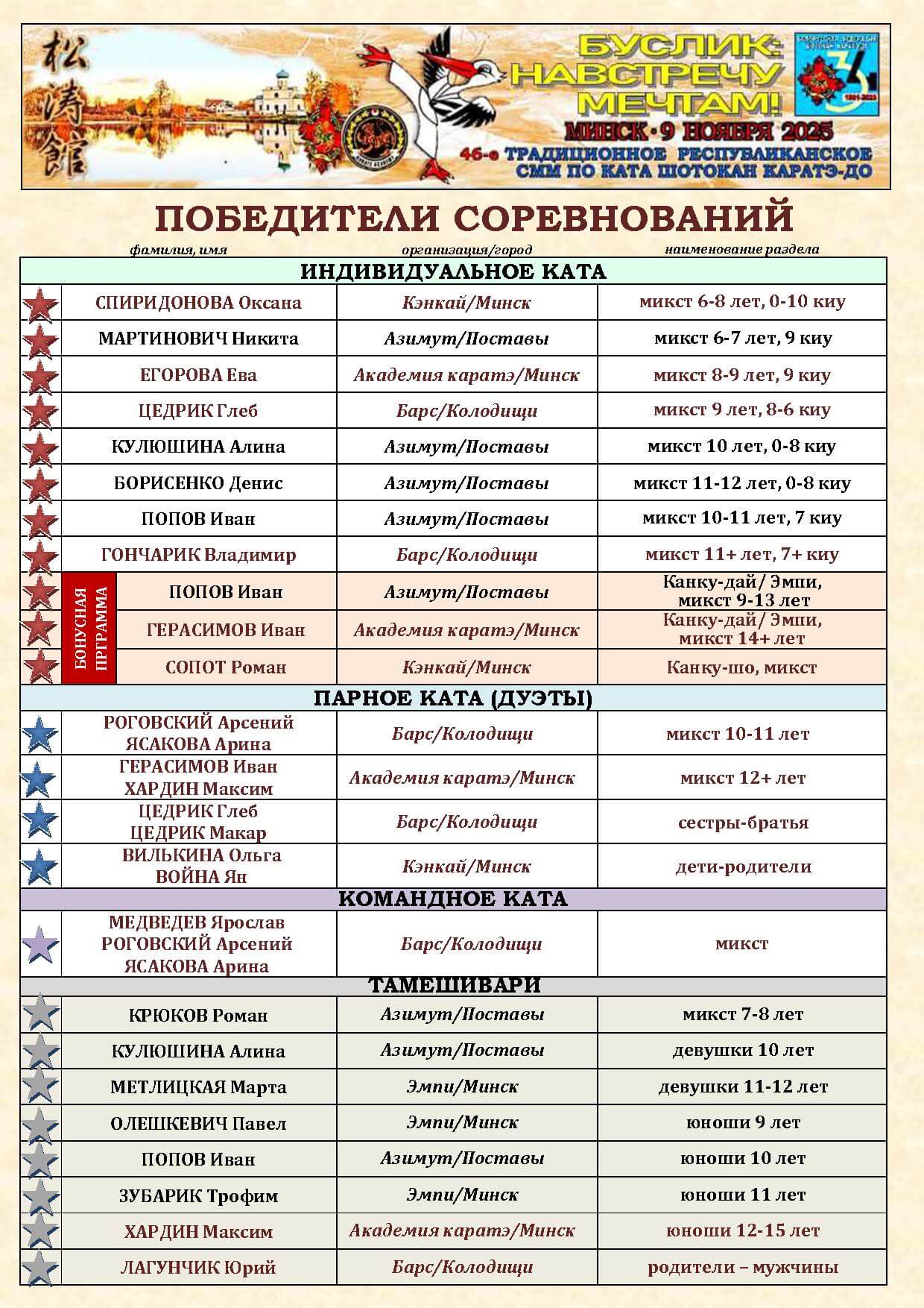 Среди лауреатов-2025 девять участников победили на Буслике впервые. Глеб и Макар Цедрики были лучшими в семейных дуэтах сестры-братья. В категории дети-родители отличились Ян Война - Ольга Вилькина и Ева Егорова - Елена Корвин-Кучинская. Золотыми медалями в бонусной программе высших индивидуальных ката награждены Иван Попов, Иван Герасимов и Роман Сопот. В разделе тамешивари Хит-Рэндж среди мужчин-родителей новый престижный рекорд Белорусской федерации шотокан каратэ-до установил Иван Самусевич, который показал результат 559 кг ударом маваши-гери (предыдущее достижение было превышено на 9 кг). Специальными призами Универсальный победитель были награждены участники, показавшие лучшие результаты в индивидуальных ката и в тамешивари. В этот раз обладателями всех трех наград стали представители клуба Азимут/Поставы: Роман Крюков, Алина Кулюшина и Иван Попов.