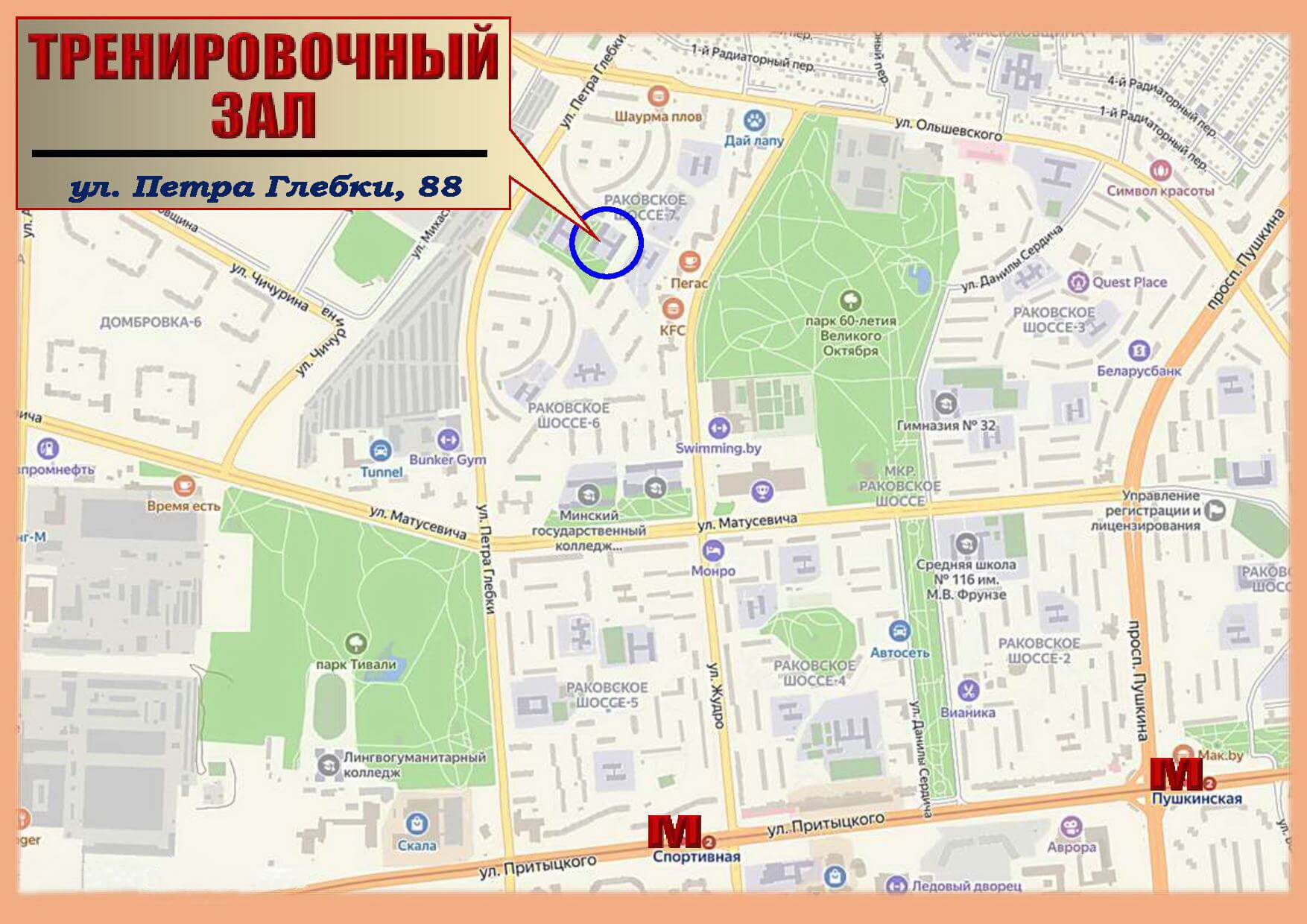 - тренировочном зале (Минск, микрорайон Раковское шоссе, ул. Петра Глебки, 88),